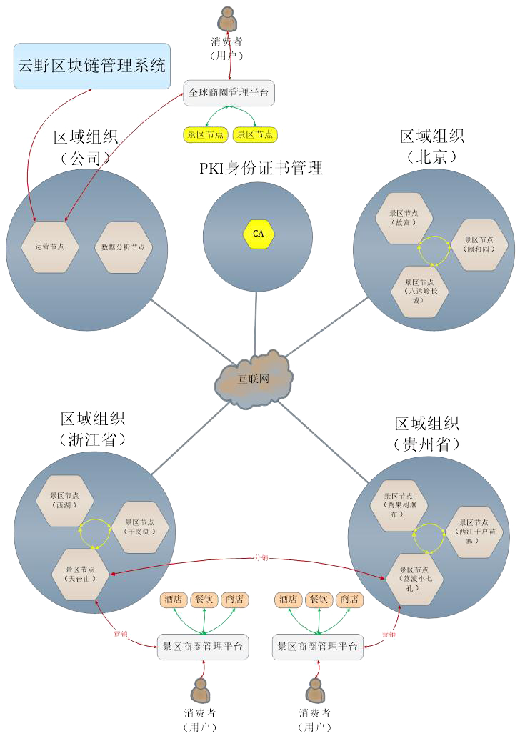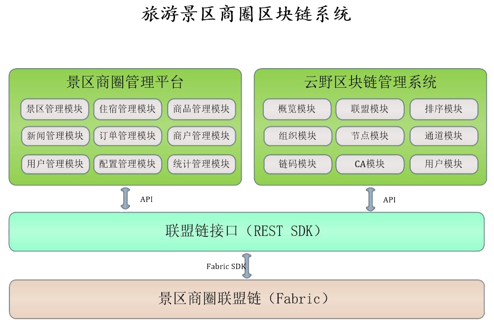 旅游景區(qū)商圈區(qū)塊鏈系統(tǒng)是建立在Hyperledger Fabric聯(lián)盟鏈區(qū)塊鏈基礎(chǔ)之上,以景區(qū)作為節(jié)點(diǎn),實(shí)現(xiàn)以景區(qū)為中心的商圈管理系統(tǒng)。本系統(tǒng)分為景區(qū)商圈聯(lián)盟鏈、聯(lián)盟鏈接口和景區(qū)商圈管理平臺三大子系統(tǒng)。
