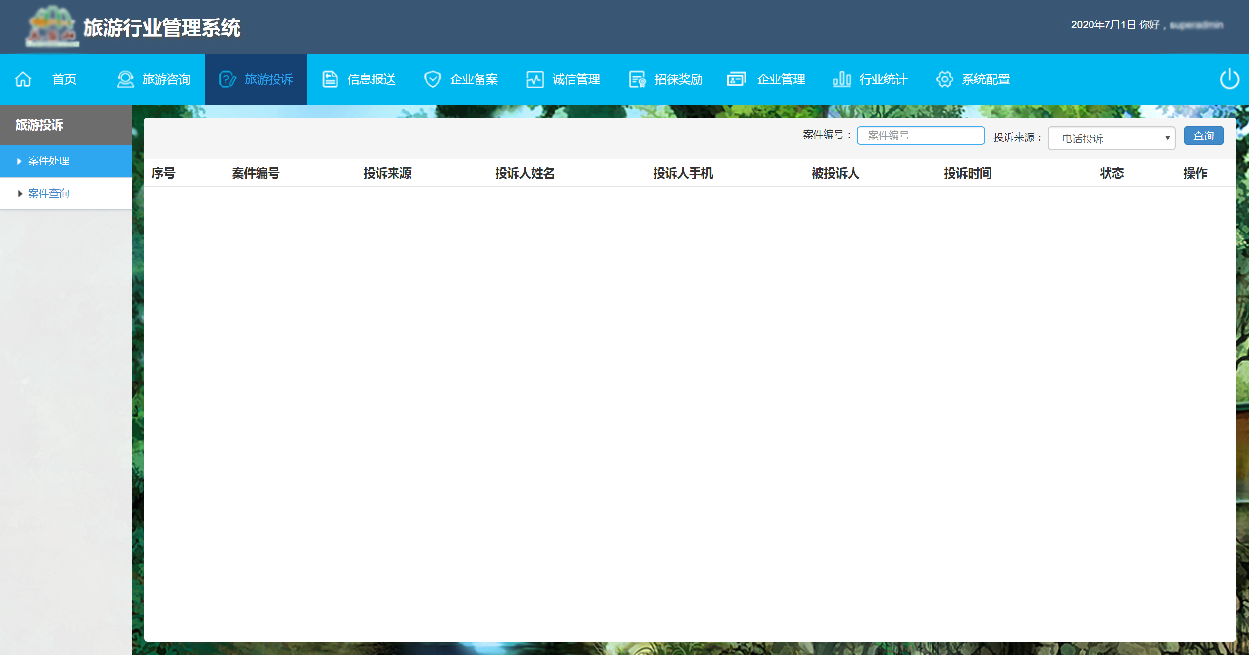 包括咨詢與投訴管理、旅游行業(yè)與涉旅企業(yè)管理、旅游誠信管理等子系統(tǒng),提供游客投訴渠道,對游客投訴的問題進(jìn)行流程化處理、追溯,提升游客游覽滿意度。圍繞旅游企業(yè)信息報(bào)送、旅游企業(yè)備案、旅游業(yè)態(tài)評定、旅游行業(yè)統(tǒng)計(jì)、旅游從業(yè)人員管理、游客招徠獎(jiǎng)勵(lì)等全方位管理。針對涉旅商家的誠信評價(jià)、不良商家曝光、投訴反饋、商家信用等全面監(jiān)管。