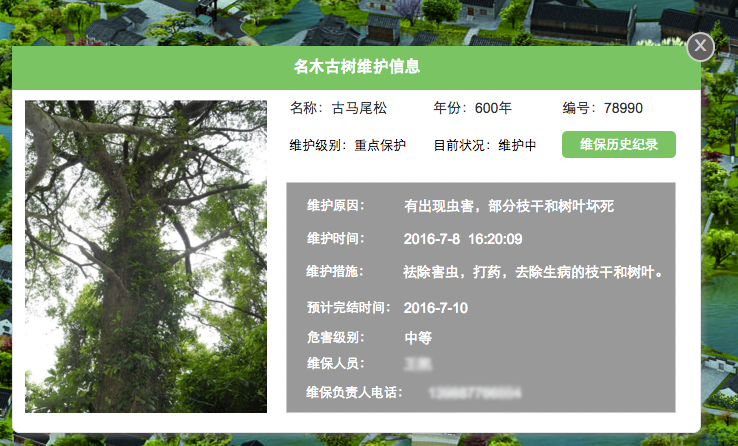 結(jié)合GIS地圖,實時展示每一個設(shè)備的正在維保維修中的信息,維保人員根據(jù)維保任務(wù)計劃周期時間,定時為景區(qū)設(shè)施設(shè)備進(jìn)行巡檢和維護(hù)。同時也能查看每一個設(shè)備的維保歷史記錄,以及正在維保的狀態(tài)跟蹤。