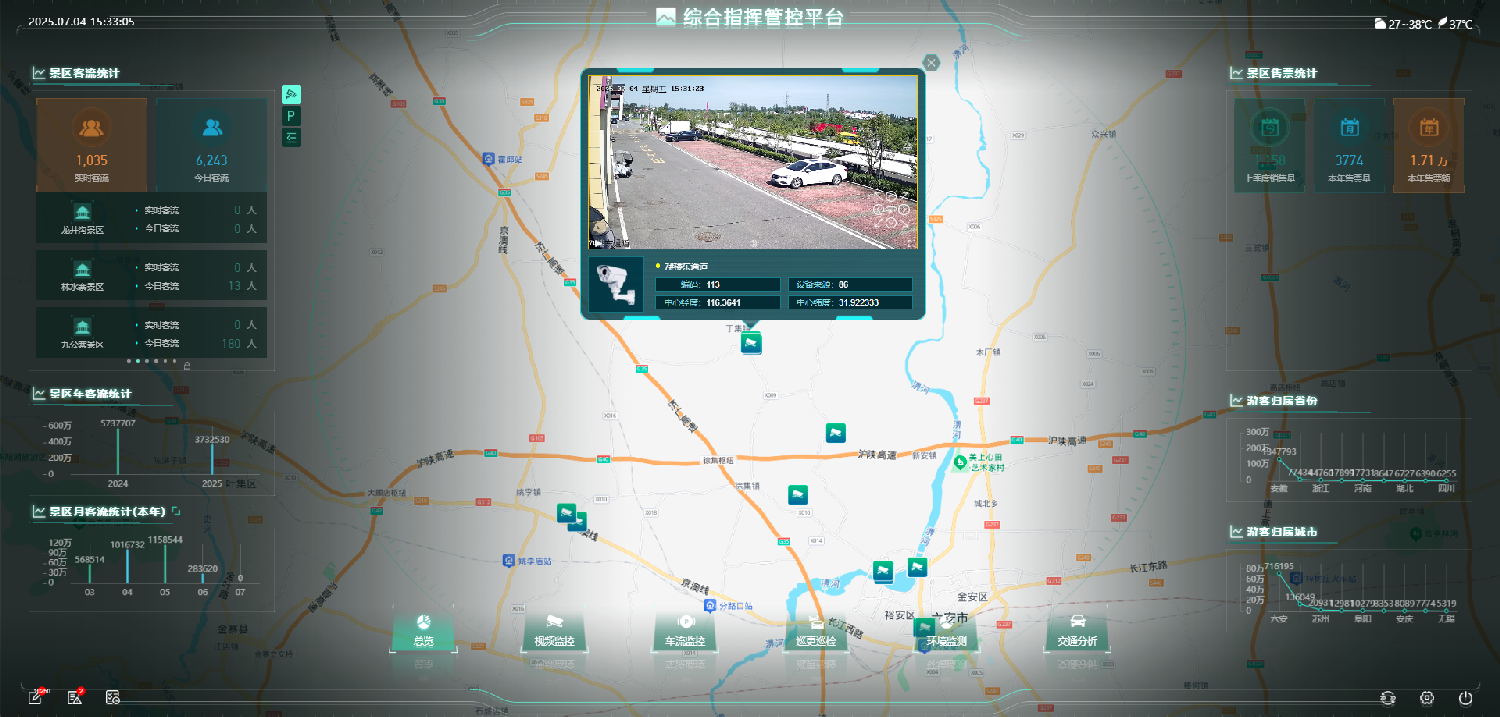 系統(tǒng)主要功能包括:旅游要素查看、輿情查詢、視頻監(jiān)控系統(tǒng)、信息統(tǒng)一發(fā)布系統(tǒng)、景區(qū)管理、游客管理、分析模型等功能。
