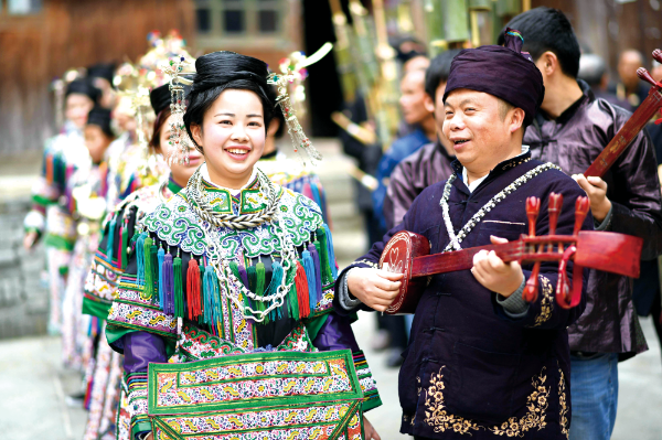 △ 2018年1月17日,在貴州榕江縣寨蒿鎮(zhèn)扒王村宰管侗寨,侗族群眾身穿盛裝參加侗年踩歌堂活動。王炳真攝
