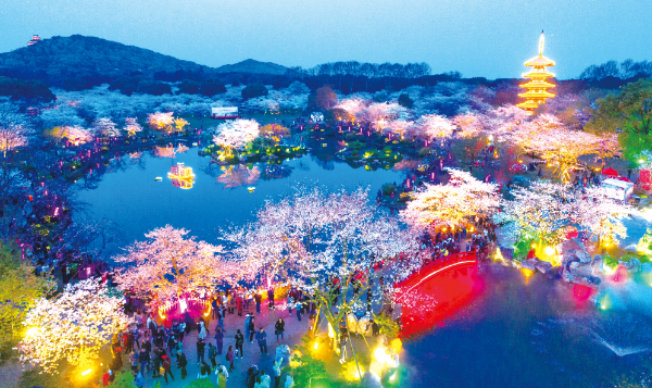 △ 武漢櫻花繽紛醉游人,東湖櫻花園在夜間開啟裝飾燈光,2018年3月26日,無人機拍攝下游客在夜色中賞櫻的畫面。熊琦攝