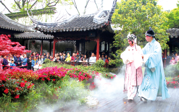 △ 2018年4月5日,2018“留園尋夢”吳文化特色游活動在蘇州古典園林留園啟動,昆曲、評彈、古琴等地方特色表演,向中外游客展現(xiàn)地方風(fēng)情。王建康攝