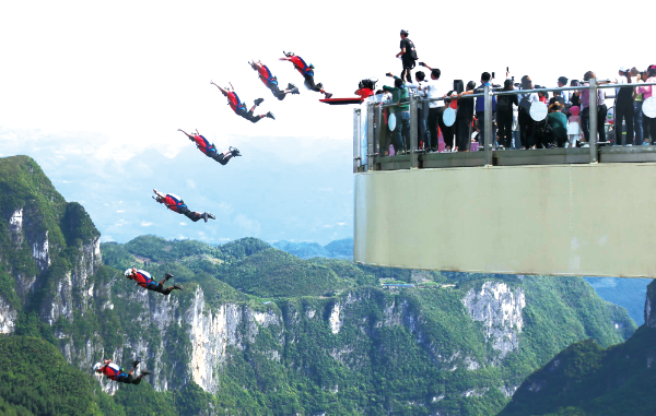 △ 2018年4月27日,中國(重慶·云陽)第二屆世界低空跳傘大賽在重慶云陽龍缸景區(qū)舉行,來自美國、加拿大、澳大利亞、委內(nèi)瑞拉、智利等國家的16位世界頂級低空跳傘選手,以極其精湛的低空跳傘技藝挑戰(zhàn)世界第一懸挑玻璃廊橋——云端廊橋。劉興敏攝