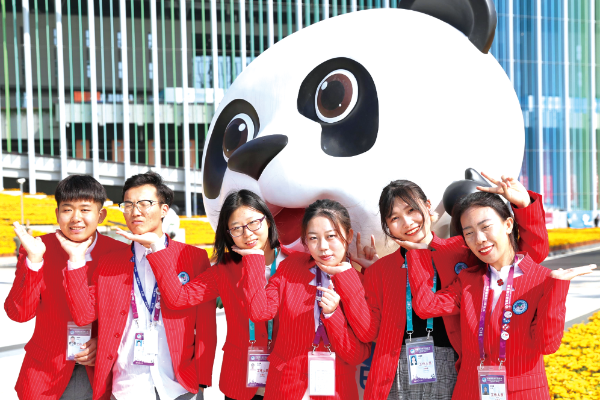 △ 2018年11月10日,首屆中國國際進口博覽會完滿閉幕。進博會志愿者“小葉子”在國家會展中心(上海)合影留念。張亨偉攝