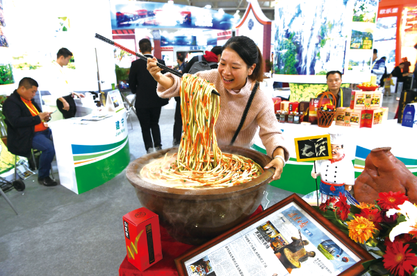 △ 2018年11月30日,第四屆“海上絲綢之路”(福州)國際旅游節(jié)在福州海峽國際會展中心開幕,參觀者被福建尤溪大條面模型吸引。王東明攝