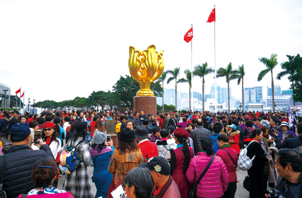 △ 2018年12月13日,經(jīng)過一個月的維修,位于香港金紫荊廣場的金紫荊雕塑重新亮相,吸引眾多內(nèi)地游客“打卡”拍照。張煒攝