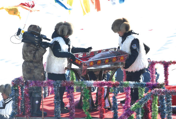 △ 2018年12月28日,查干湖冰雪漁獵文化旅游節(jié)在吉林松原拉開帷幕,數(shù)萬海內(nèi)外游客冒著嚴(yán)寒趕到現(xiàn)場觀看“冰湖騰魚”勝景。張瑤攝