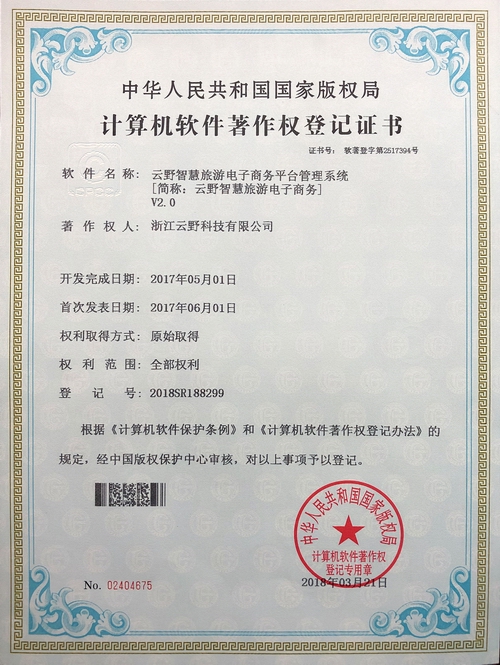 《云野智慧旅游電子商務(wù)平臺(tái)管理系統(tǒng)V2.0》于2018年3月21日被正式授予《中華人民共和國國家版權(quán)局計(jì)算機(jī)軟件著作權(quán)登記證書》,登記號(hào)為2018SR188299。