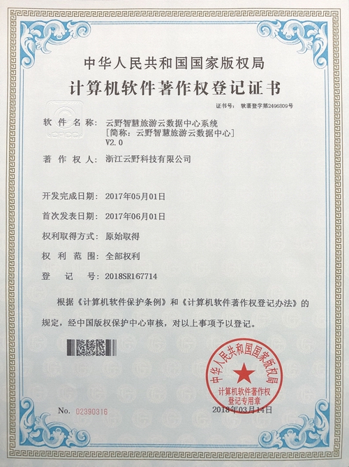 《云野智慧旅游云數(shù)據(jù)中心系統(tǒng)V2.0》于2018年3月14日被正式授予《中華人民共和國國家版權(quán)局計(jì)算機(jī)軟件著作權(quán)登記證書》,登記號(hào)為2018SR167714。