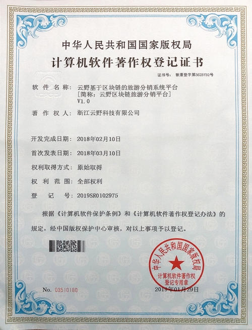 《云野基于區(qū)塊鏈的旅游分銷系統(tǒng)平臺(tái)V1.0》于2019年1月29日被正式授予《中華人民共和國國家版權(quán)局計(jì)算機(jī)軟件著作權(quán)登記證書》,登記號(hào)為2019SR102975。