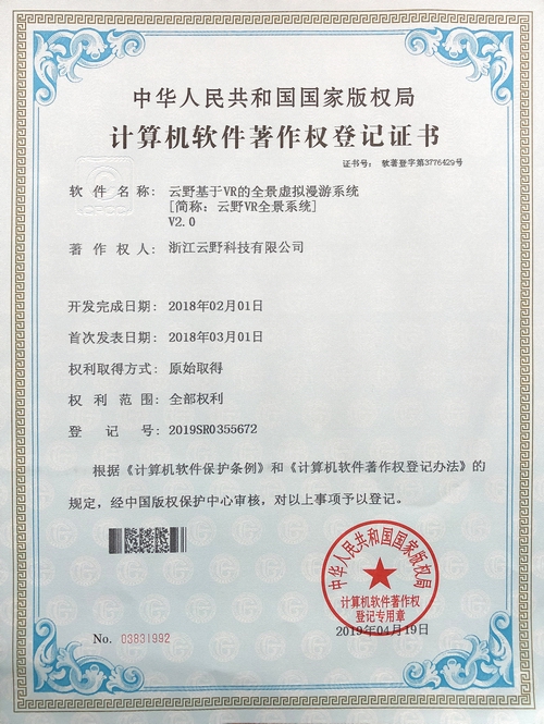 《云野基于VR的全景虛擬漫游系統(tǒng)V2.0》于2019年4月19日被正式授予《中華人民共和國國家版權(quán)局計(jì)算機(jī)軟件著作權(quán)登記證書》,登記號(hào)為2019SR355672。