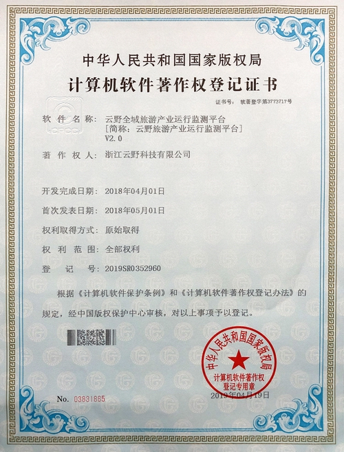 《云野全域智慧旅游綜合集成管理服務(wù)平臺(tái)V2.0》于2019年4月19日被正式授予《中華人民共和國國家版權(quán)局計(jì)算機(jī)軟件著作權(quán)登記證書》,登記號(hào)為2019SR0352516。