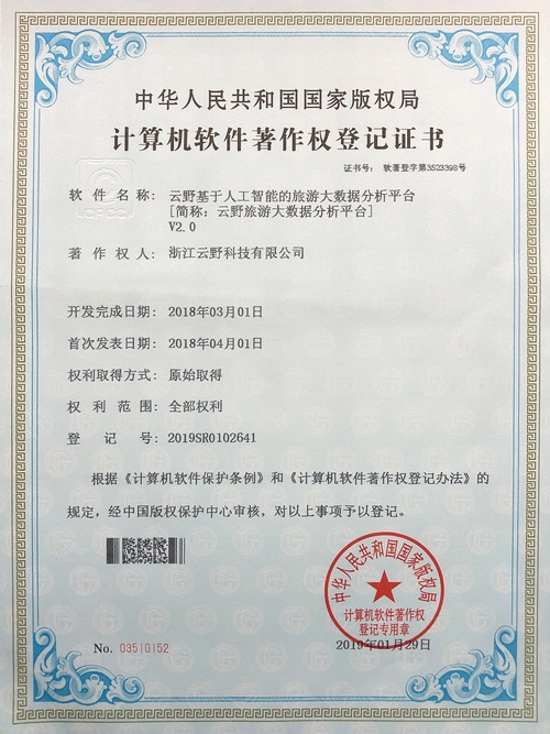 《云野基于人工智能的旅游大數(shù)據(jù)分析平臺(tái)V2.0》于2019年1月29日被正式授予《中華人民共和國國家版權(quán)局計(jì)算機(jī)軟件著作權(quán)登記證書》,登記號(hào)為2019SR0102641。
