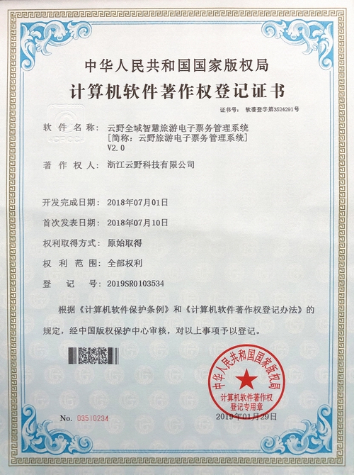 《云野全域智慧旅游電子票務(wù)管理系統(tǒng)V2.0》于2019年1月29日被正式授予《中華人民共和國國家版權(quán)局計(jì)算機(jī)軟件著作權(quán)登記證書》,登記號(hào)為2019SR0103534。