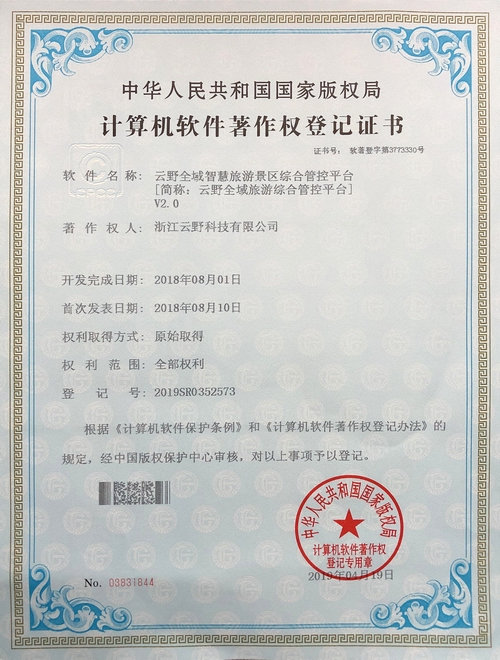 《云野全域智慧旅游景區(qū)綜合管控平臺(tái)V2.0》于2019年4月19日被正式授予《中華人民共和國國家版權(quán)局計(jì)算機(jī)軟件著作權(quán)登記證書》,登記號(hào)為2019SR0352573。