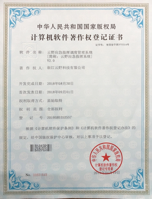 《云野應(yīng)急指揮調(diào)度管理系統(tǒng)V2.0》于2019年4月19日被正式授予《中華人民共和國國家版權(quán)局計(jì)算機(jī)軟件著作權(quán)登記證書》,登記號(hào)為2019SR0352557。