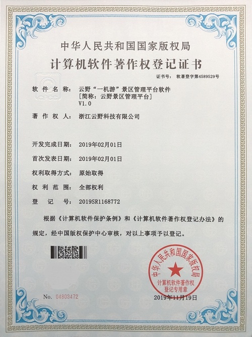《云野“一機(jī)游”景區(qū)管理平臺(tái)軟件V1.0》于2019年11月19日被正式授予《中華人民共和國國家版權(quán)局計(jì)算機(jī)軟件著作權(quán)登記證書》,登記號(hào)為2019SR1168772。