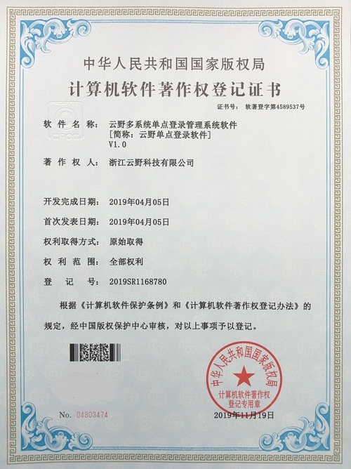 《云野多系統(tǒng)單點(diǎn)登錄管理系統(tǒng)軟件V1.0》于2019年11月19日被正式授予《中華人民共和國國家版權(quán)局計(jì)算機(jī)軟件著作權(quán)登記證書》,登記號(hào)為2019SR1168780。