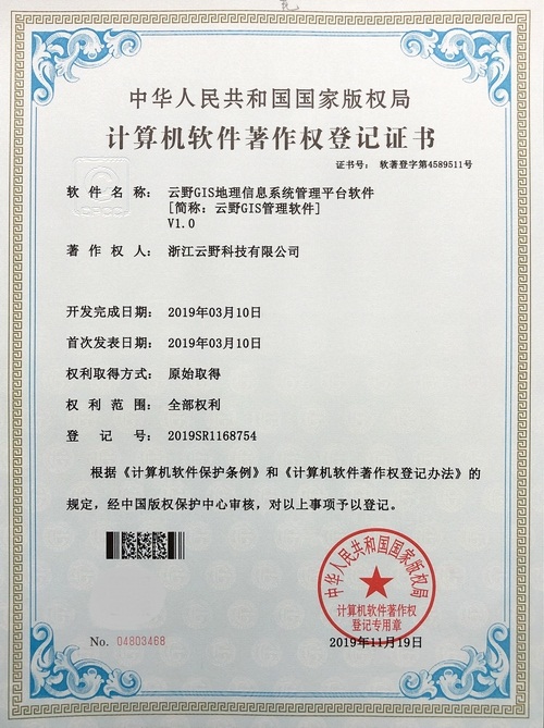 《云野GIS地理信息系統(tǒng)管理平臺(tái)軟件V1.0》于2019年11月19日被正式授予《中華人民共和國國家版權(quán)局計(jì)算機(jī)軟件著作權(quán)登記證書》,登記號(hào)為2019SR1168754。