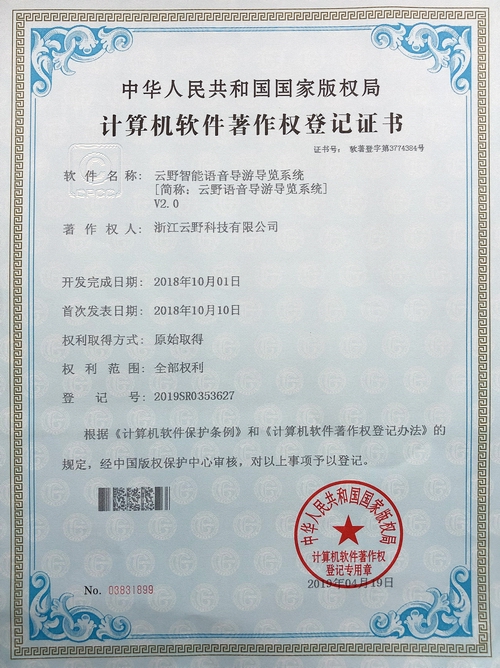《云野智能語音導(dǎo)游導(dǎo)覽系統(tǒng)V2.0》于2019年4月19日被正式授予《中華人民共和國國家版權(quán)局計(jì)算機(jī)軟件著作權(quán)登記證書》,登記號(hào)為2019SR0353627。