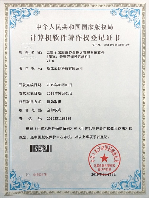 《云野全域旅游咨詢投訴管理系統(tǒng)軟件V1.0》于2019年11月19日被正式授予《中華人民共和國國家版權(quán)局計(jì)算機(jī)軟件著作權(quán)登記證書》,登記號(hào)為2019SR1168789。