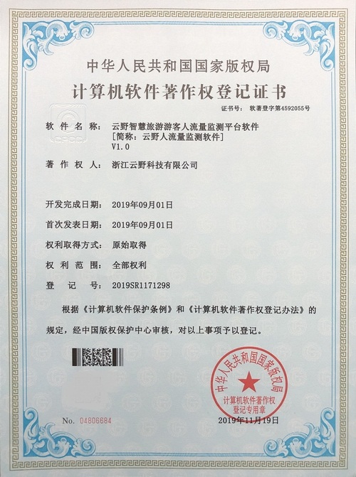 《云野智慧旅游游客人流量監(jiān)測平臺(tái)軟件V1.0》于2019年11月19日被正式授予《中華人民共和國國家版權(quán)局計(jì)算機(jī)軟件著作權(quán)登記證書》,登記號(hào)為2019SR1171298。