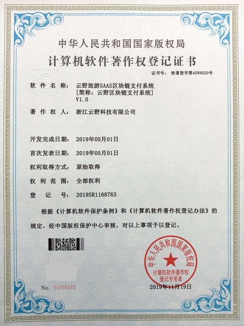 《云野旅游SAAS區(qū)塊鏈支付系統(tǒng)V1.0》于2019年11月19日被正式授予《中華人民共和國國家版權(quán)局計(jì)算機(jī)軟件著作權(quán)登記證書》,登記號(hào)為2019SR1168763。